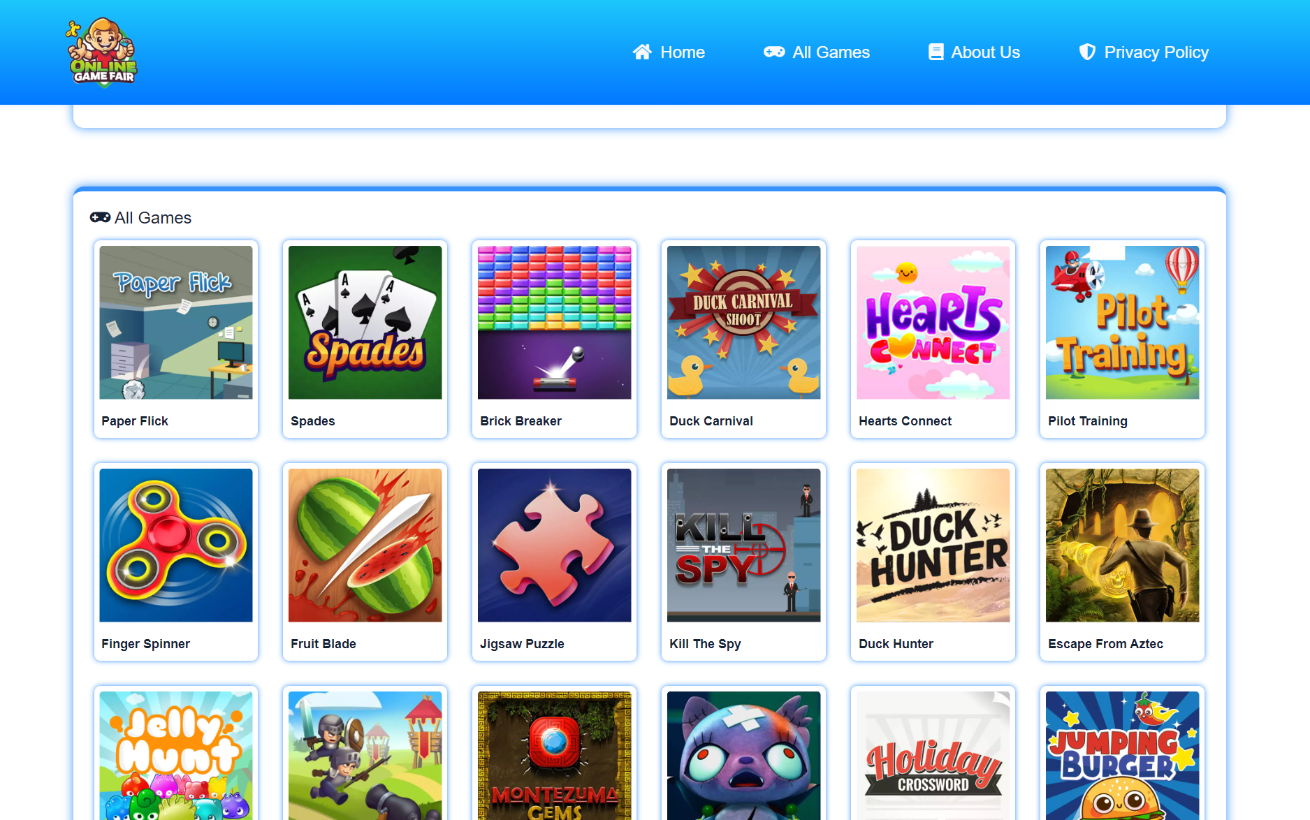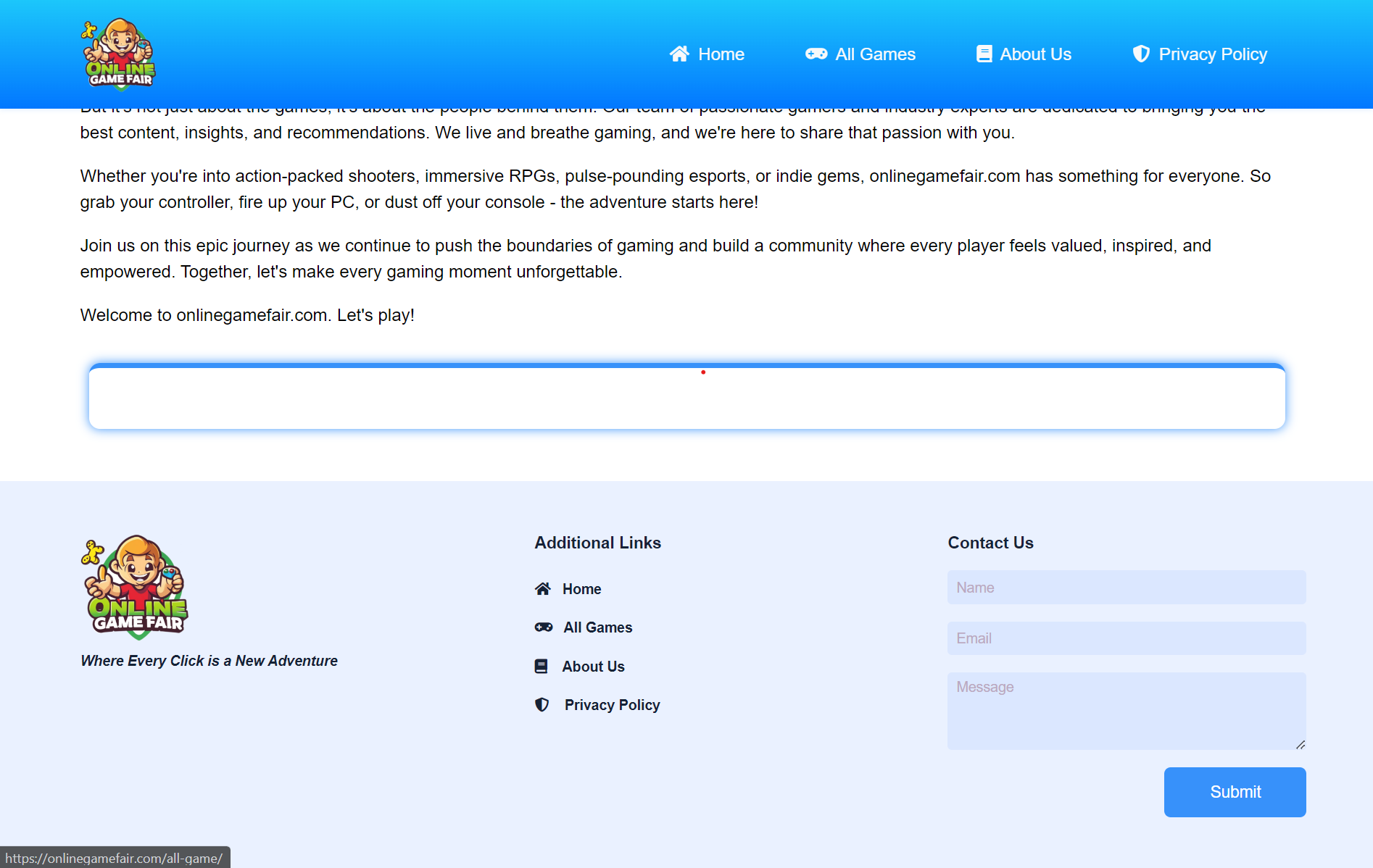 OnlineGameFair is the ultimate destination for gamers seeking fun, adventure, and endless enjoyment. Our website, built with cutting-edge front-end technologies like HTML, CSS, Bootstrap, and JavaScript, offers a seamless and engaging user experience. Whether you're a casual player or a hardcore gamer, OnlineGameFair provides a diverse array of games that cater to all tastes. The responsive design ensures that you can enjoy your favorite games on any device, anytime. Dive into a world of excitement and challenge your skills with our extensive game library.